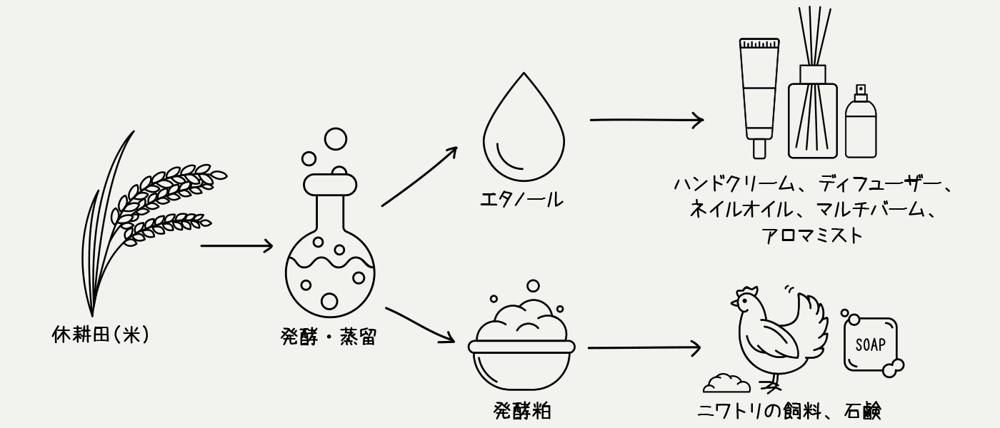 そんな時、展示会でたまたま稲穂が見えて寄って行ったら、酒井さんがいらっしゃりアロマスプレーが置いてありました。どのような商品か伺うと、水田の減反政策が進んでいることや、休耕田だった水田で栽培したお米をエタノールにしているという話を聞き、直感でこれしかないと思いました。