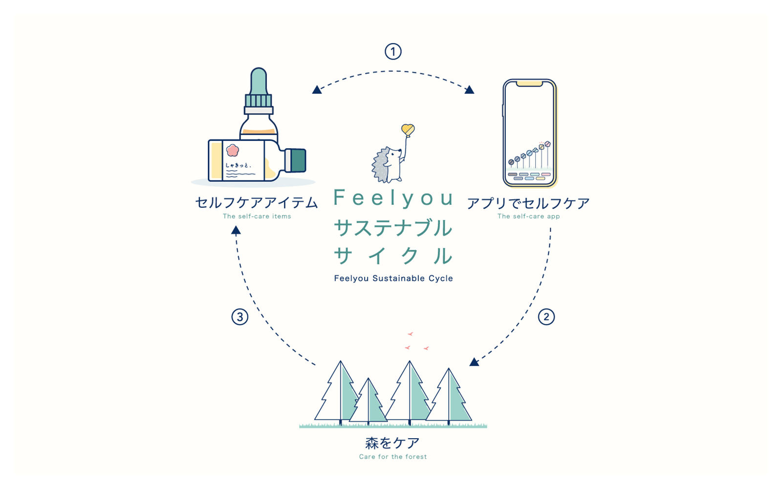 この仕組みを「Feelyou Sustainable Cycle」と名付け、自分をケアすれば、周囲にも広がり、ひいては地球環境のことを考え始めることができる、アプリとプロダクトを使えば、自動的に環境に貢献ができてしまうというサイクルです。「デジタルライフでもセルフケアを日常に」と掲げているのは、コロナが終わってもオンライン比率はあまり小さくならず、1日の8割ほどがオンラインを駆使する世界になっていくと考えていますので、そのようなデジタルライフでもセルフケアができる場所をデザインしたいためです。